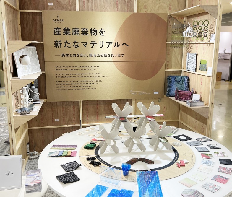 私たちはディレクターズブースにて弊社のサステナブル事業「SENSE-Laboratory」の会員制Labで研究している工場廃材のマテリアル化や実験的プロダクトを展示します。